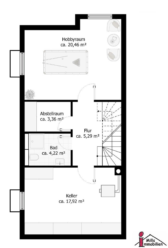 Hobbyraum in Wohnraumqualität, Duschbad, Abstellraum, Waschküche und Flur