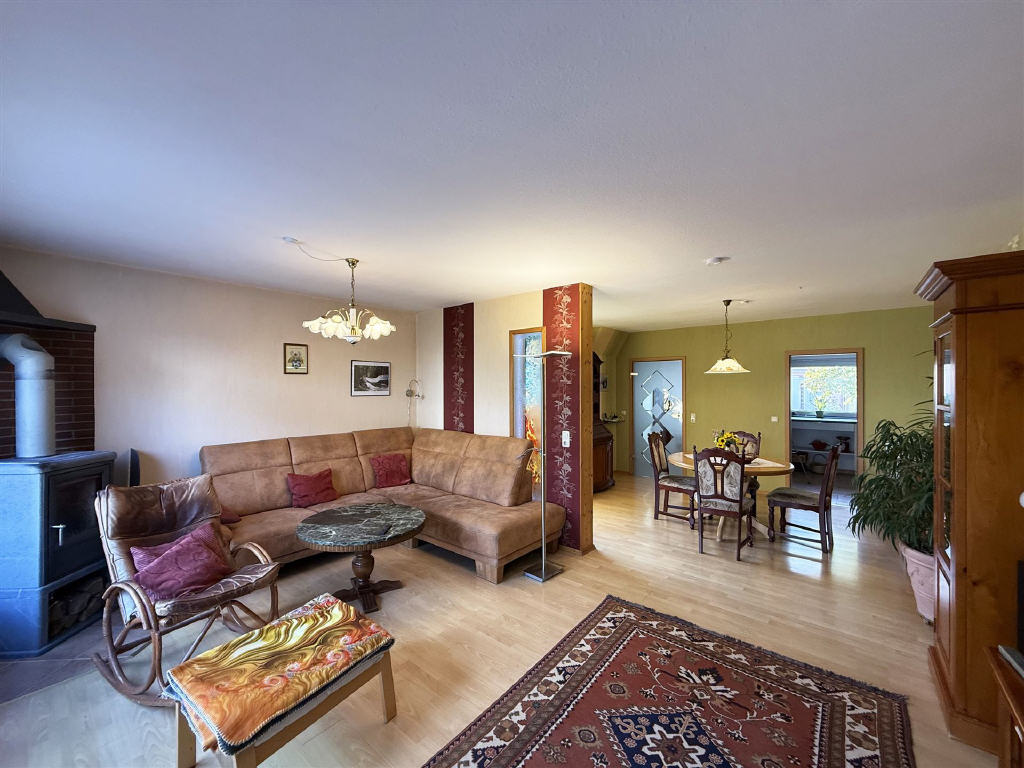 großes Wohn- und Esszimmer mit Holzofen und Zugang zur Terrasse, Küche,