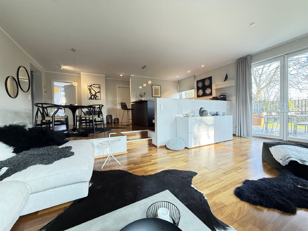 niveauversetztes Wohnzimmer mit Zugang zur Terrasse, offene Küche, Essbereich,