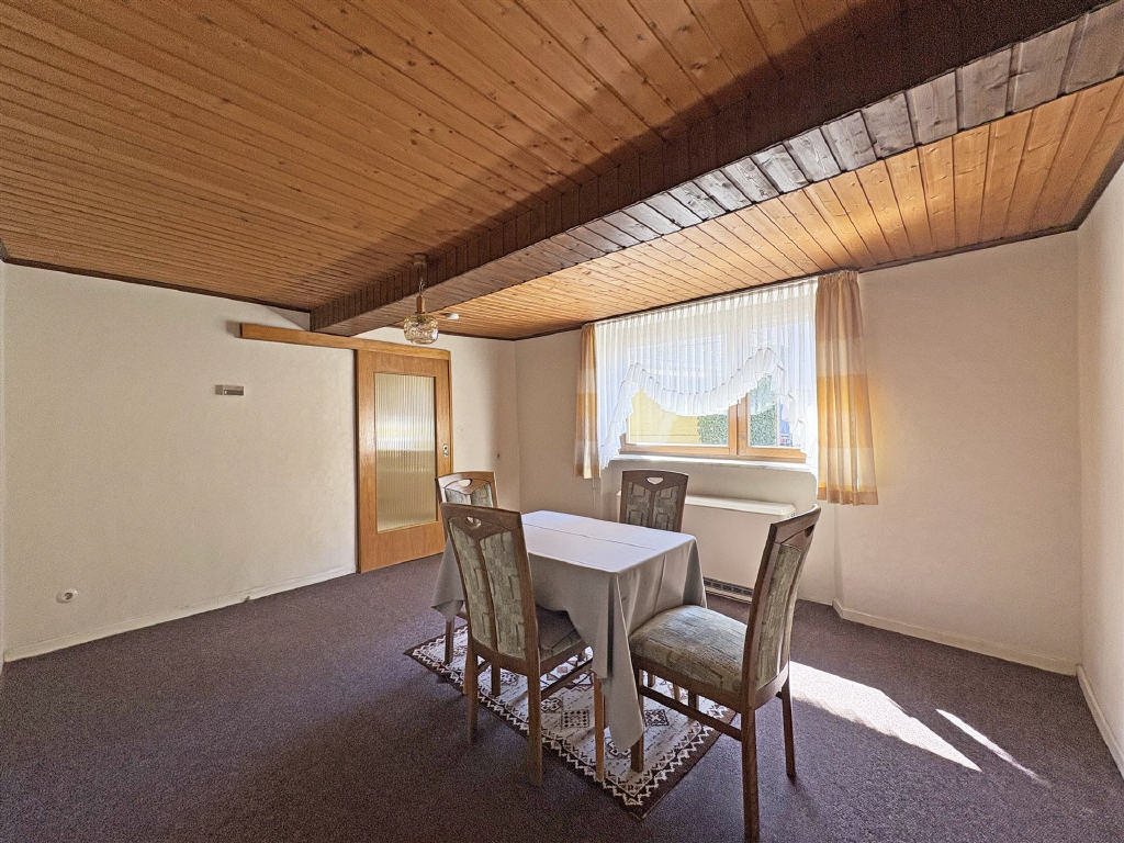 Wohn-/Esszimmer mit Kamin und Zugang zur Terrasse, 2 Zimmer, Flur und Tageslichtbad
