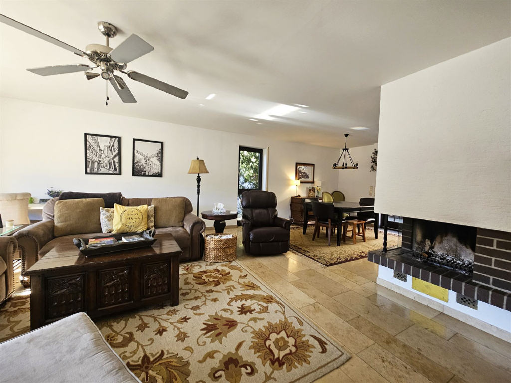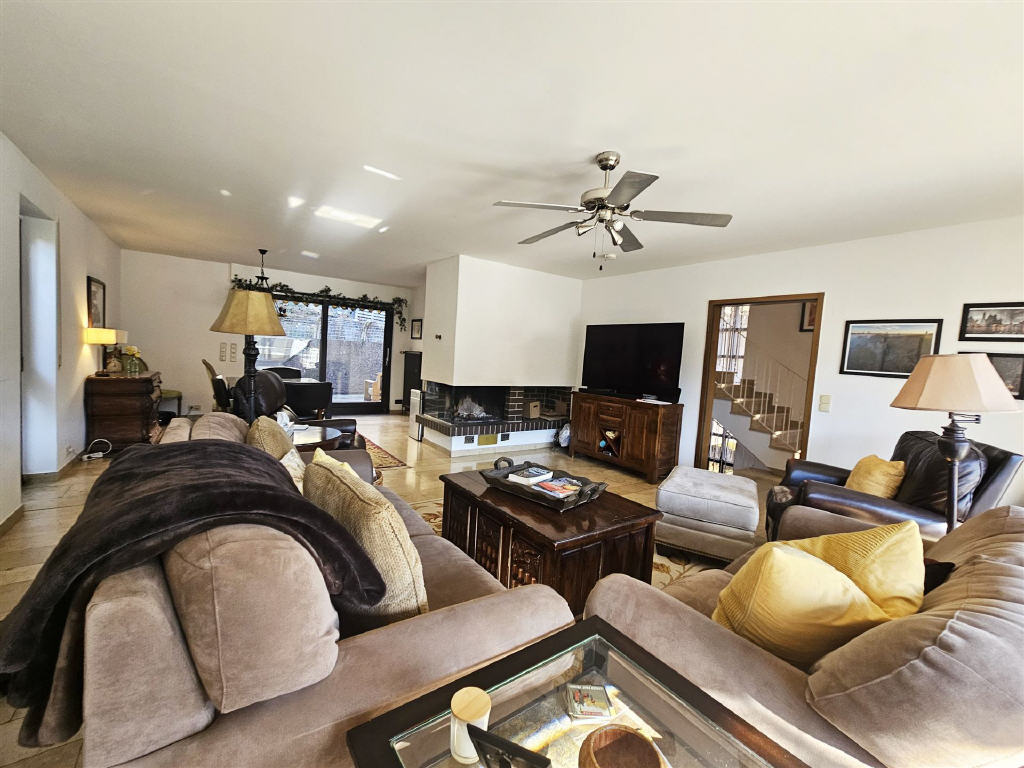 großes Wohn- und Esszimmer mit Kamin, Zugang zur Terrasse und zum Sonnenbalkon,
