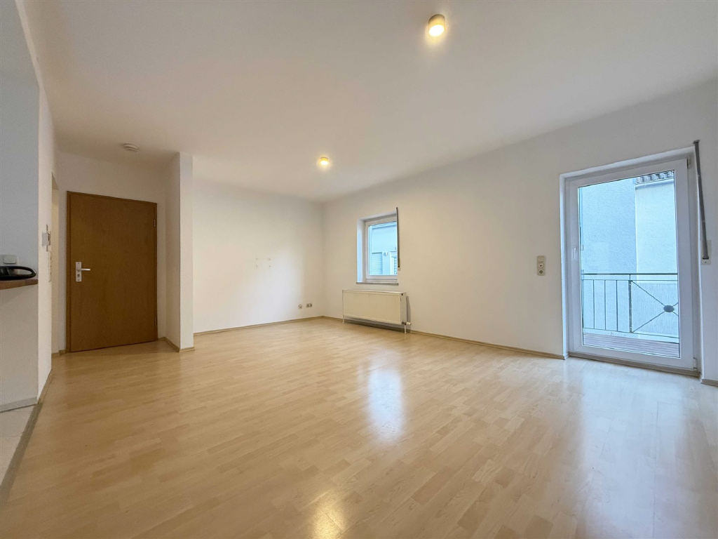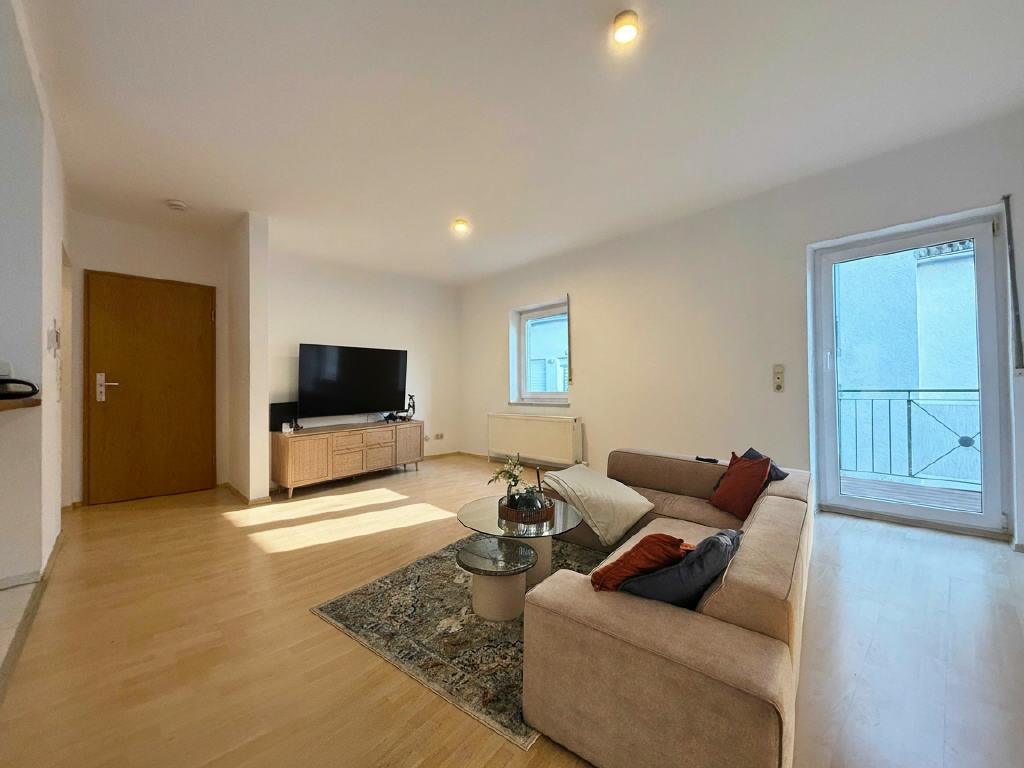 helles Wohn- und Esszimmer mit Balkon, offene Küche mit französischem Balkon,