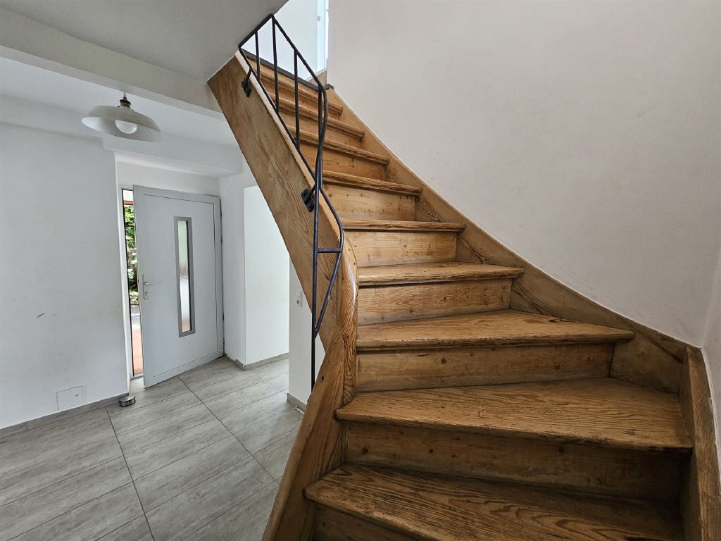 aufwändig restaurierte Holztreppe, Wohnküche mit sehr schön aufgearbeiteter Holzbalkendecke, Böden mit Parkett, Vinyl und hochwertigen Fliesen