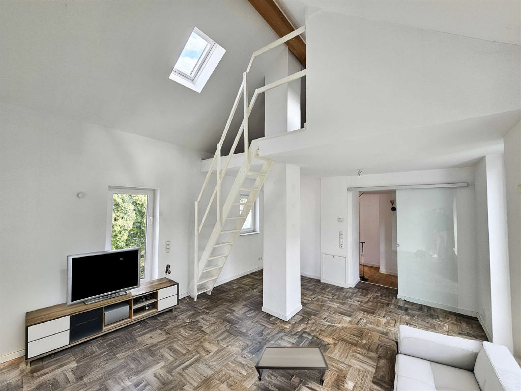 schönes Wohnzimmer mit kleiner Galerie und z.T. Raumhöhe bis unter den Giebel, Schlafzimmer und