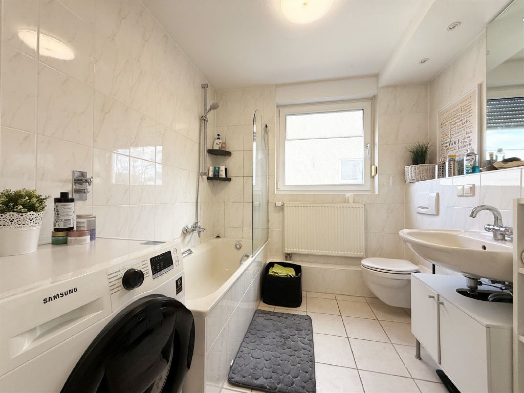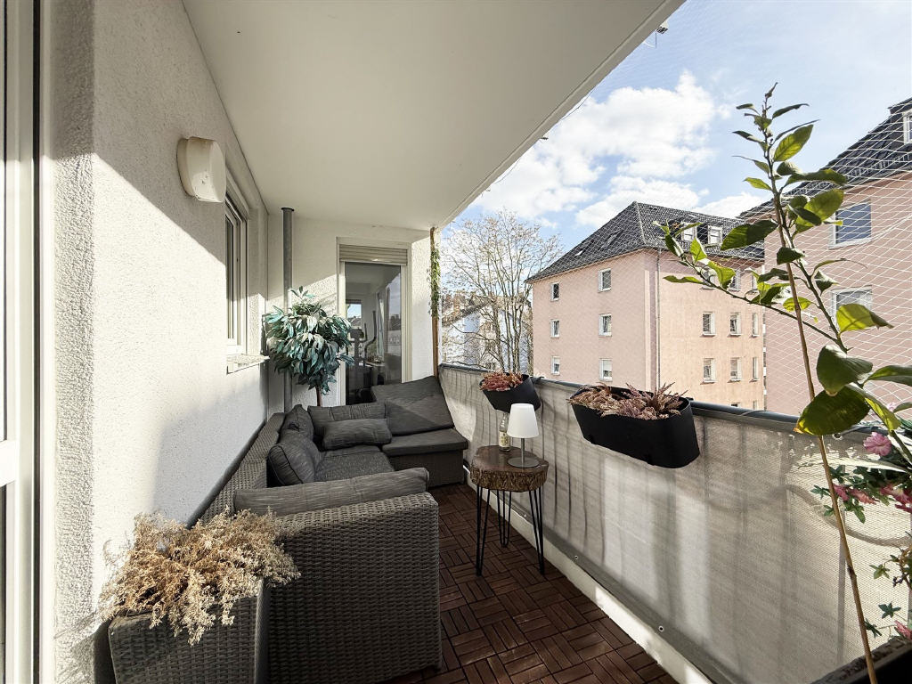 sonniger und geschützter Balkon, zeitlos gefliestes Bad und Waschmaschinenanschluss innerhalb der